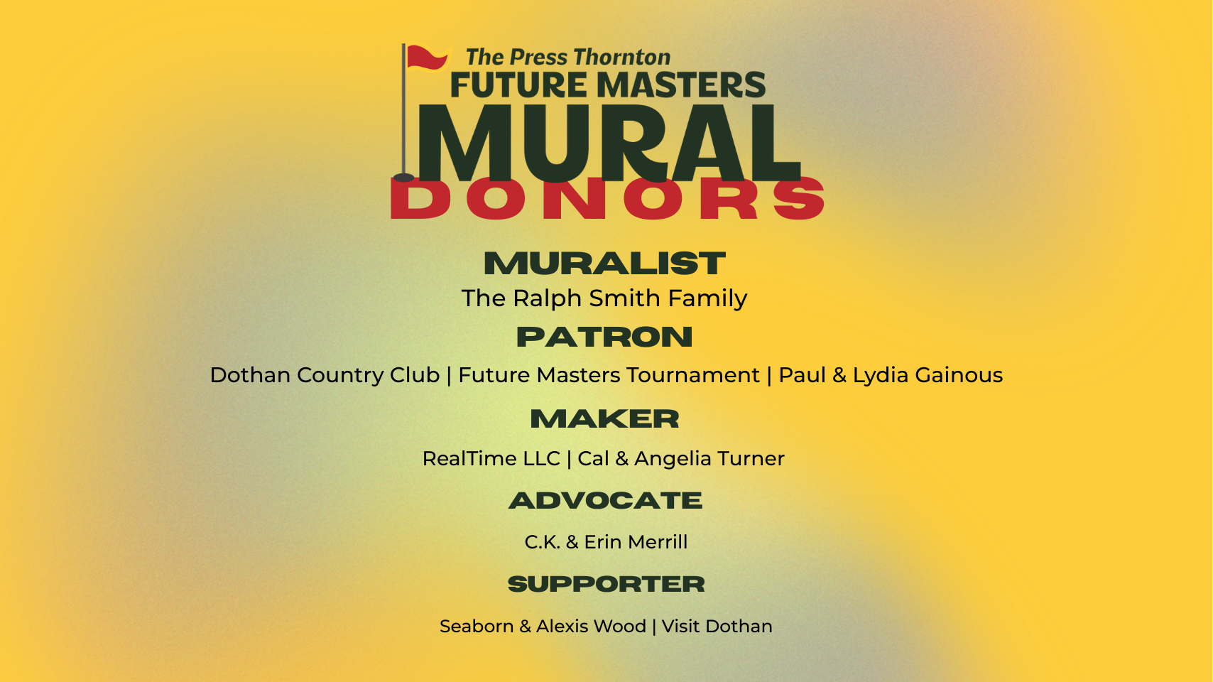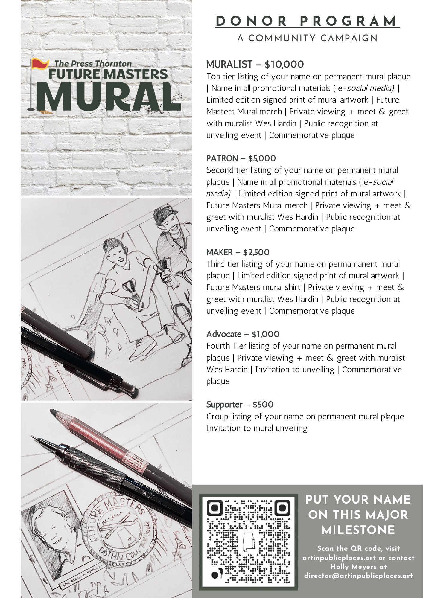 FUTURE MASTERS MURAL Post author By artinpublicplaces Post date May 16, 2025 Categories In Art Coming FALL 2025! Giving Become a donor Buy Merch Checks can be made to Art in Public Places PO Box 91, Dothan, Alabama 36301